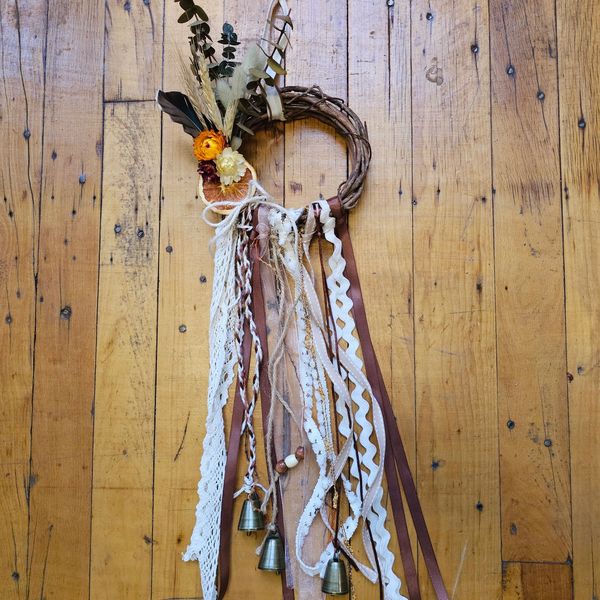 Together, we’ll craft Witch Bells - beautiful, intention-filled grapevine wreaths adorned with your own custom selection of dried flowers, ribbons, bells, charms, feathers, and more.